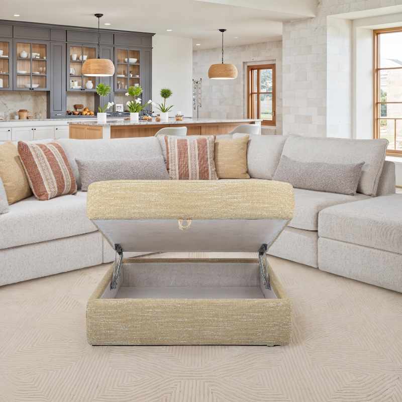 • Optional storage ottoman adds extra seating, a cozy footrest, or hidden storage—use it as part of your sectional or as a standalone cocktail ottoman, with custom fabric options to match