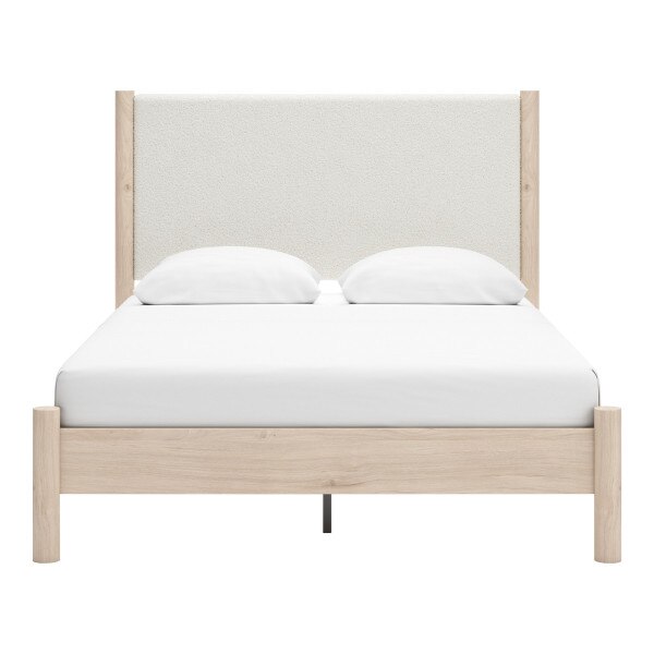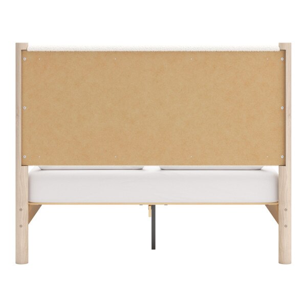 This panel bed is made with engineered wood (MDF/particleboard/plywood) and decorative laminate for the right balance of affordability and durability. Featuring decorative post legs and creamy white boucle polyester upholstery. Minor assembly required. Pairs with other items in the series to make a bed kit.