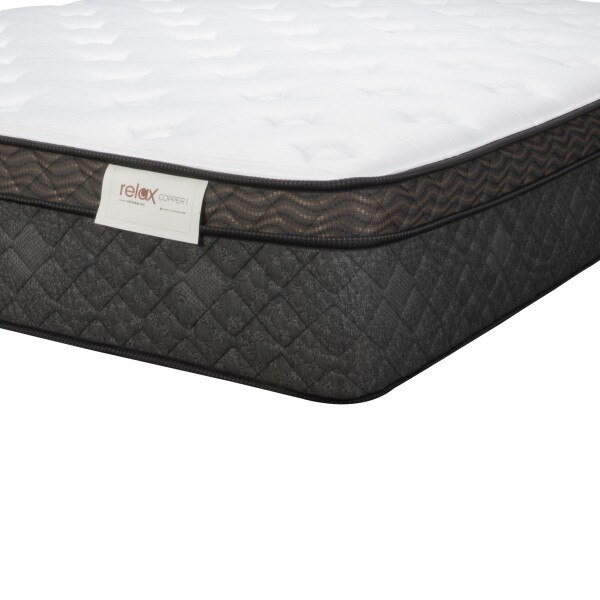 Tepperman's RELAX, Copper I, Euro Top offers medium feel support, suitable for all sleep positions. The premium Cold touch fabric helps regulates your body temperature; fall asleep faster and keep cooler throughout the night. More features to support your comfort are a layer of High-Density Bio Foam paired with a layer of our Airways™ technology specialty foam; easing pressure points and is infused with Copper Gel which aids in preventing odor, has antimicrobial properties, along with healthy rejuvenating benefits.