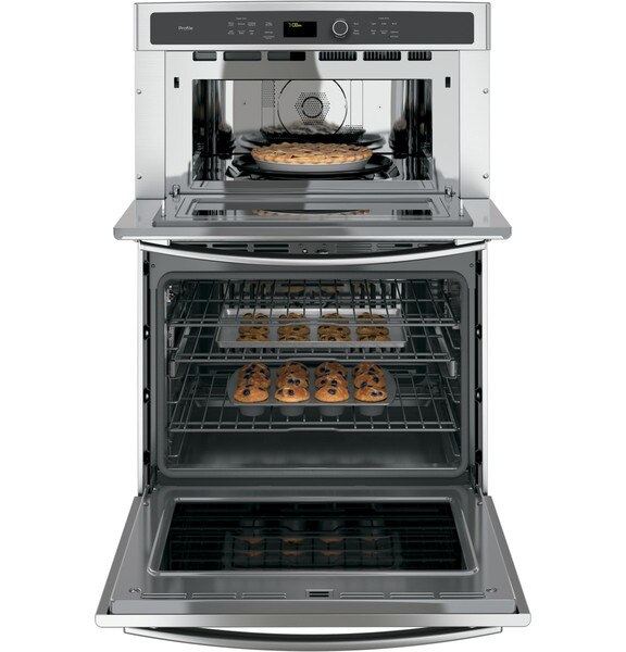 Preparing your meal is now a piece of cake with this Profile combination microwave/wall oven. A great solution any of your cooking and kitchen needs. It comes equipped with a convection microwave and True European convection oven for perfectly baked bake goods. A large window allows you to keep an eye on your dishes food with ease. The self-cleaning function with optional steam makes clean-up a breeze.