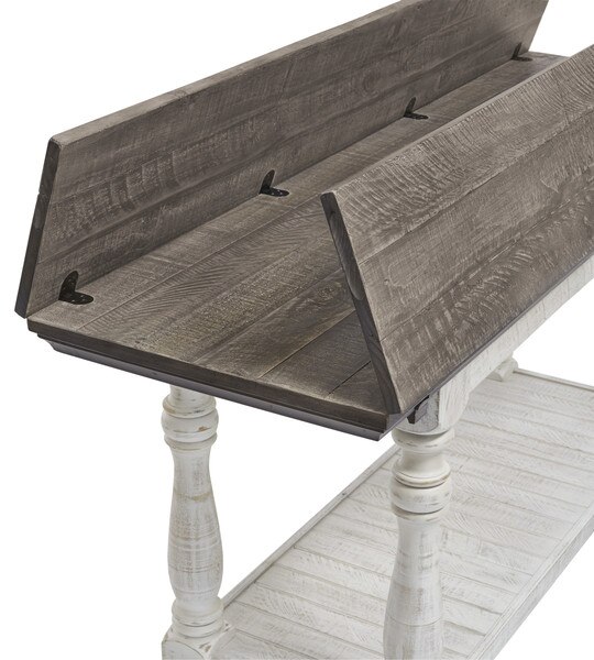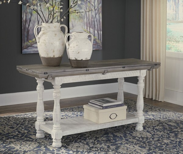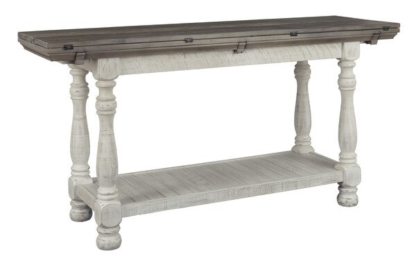 With its richly rustic finish and textural mix, this flip top sofa table goes to town on bygone beauty. Distressed two-tone treatment blends a weathered gray with vintage white for an utterly charming effect. Expecting company? Simply open the flip top panels to instantly create additional dining space.