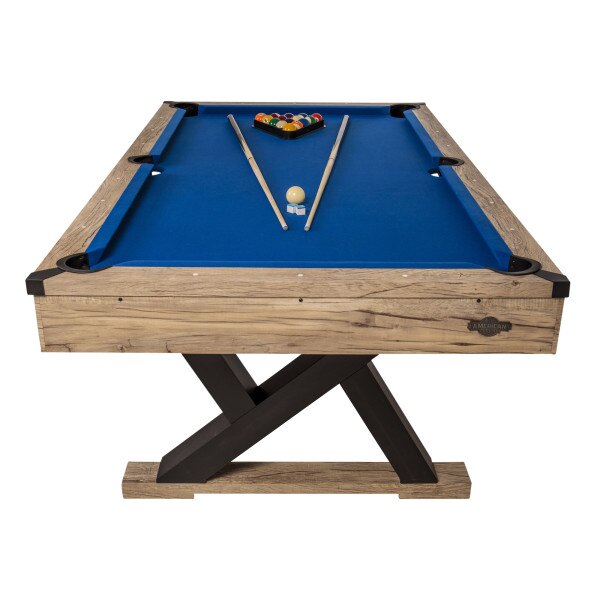 Provide your family and friends with hours of entertainment with the JANSEN 84” Billiard Table. This classic game table features a rustic finish, unique k-shaped legs, a rustic, blond cabinet and royal blue cloth – a combination that will liven up any room in any home. It’s 36mm thick engineered wood playfield with two-ply lamination prevents warping while the cloth playfield with K66 nose rubber cushions provide true, reliable bank shots and rebounds. The pool table features concealed drop pockets and shims for uneven flooring. The JANSEN is ready to play on its own with two 57” wood cues, a set of billiard balls, a triangle rack, a table brush and two pieces of chalk.