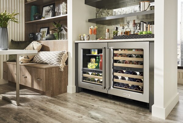 This Undercounter Beverage Center with Full-Extension Wood-Front Racks holds 14 wine bottles below with room for drinks and food on the full-width shelves above. Separate temperature controls for the two zones adjust for what you’re storing, and a Temperature Monitoring System with sensor alert adds peace of mind. Fully Flush Installation with Hidden Hinges provides a built-in look within cabinetry.