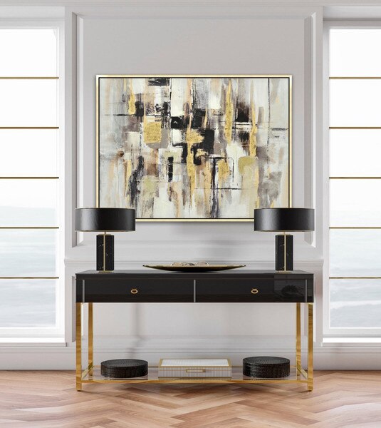 Neural composition but dramatic use of gold and black in this oil painting on gallery wrapped canvas with metallic foiled accents in a gold floating frame.