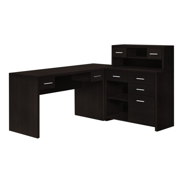 CUSTOMER ASSEMBLY REQUIRED. Outstanding functionality comes out on top with this corner computer desk in a dark brown espresso finish. It features a storage unit with hutch and offers numerous storage options: 8 storage drawers in various sizes with finished interiors and silver handles, 3 cubbies, plus the top of the hutch can be used as a shelf. For maximum convenience, this large desk has a reversible configuration, so you can set up the storage unit with hutch on the left or right according to your preference. This L-shaped computer desk saves space when used in a corner but is finished on all sides for a polished look wherever it is placed in a home office.