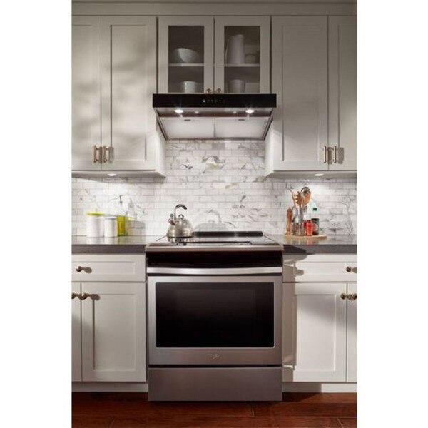 Installing this stove hood is quick and easy. The FIT system eliminates measuring, cutting and filler strips for a smooth fit every time. Once installed, the hood vent kitchen fan operates at a quiet 1.0 sone at its lowest of three fan speeds so it won't disturb family time in the kitchen. Plus, you can use the Boost function for extra suction to remove odors. A dishwasher-safe, full-width grease filter and Tap Touch controls make for an easy clean while LED task lighting helps you keep a close eye on food so each dish turns out the way you want it to. And when cooking introduces steam, grease, smoke or odors into the surrounding air, a 350 CFM motor class† takes care of it.